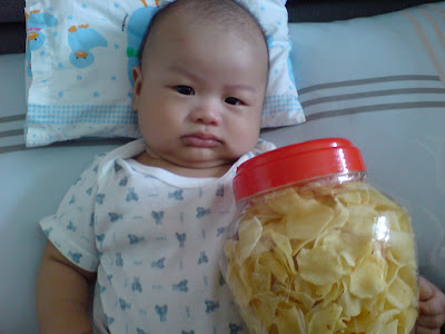 happy baby wearing cute GAP romper from nelly+ gerry. Nelly+Gerry, can you see? the clothes didnt reach me too late, wormy can still wear them! heh.